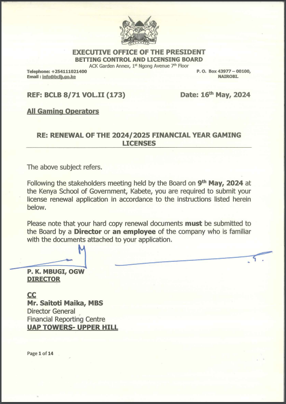在 2024 年 5 月 9 日于肯尼亚政府下卡贝特校区举行的利益相关者会议之后,董事会通知所有利益相关者,2024/2025 财政年度的许可证更新流程已开启。在此附上一份 PDF 文档,其中包含更新检查清单以及在许可证更新过程中于 GMS 上应遵循的说明和步骤。Renewal of the 2024/2025 Financial year Gaming LicensesFollowing the stakeholders meeting held on 9th May 2024 at the Kenya school of Government Lower Kabete campus, Th